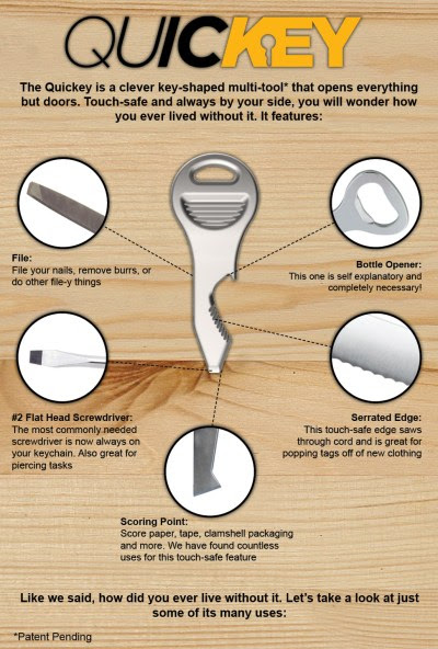 Hawker is back with his latest clever invention and rather than selling it to a distributor he’s doing it all himself. The product, called the Quickey, is basically an all-in-one utility key with a little saw, bottle opener, scraper, screwdriver, and knife that lets you do things around the house.