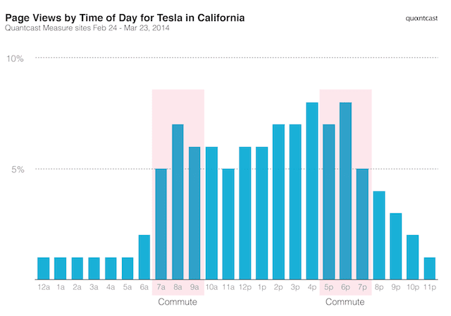 Quantcast also found relatively uniform usage between 7am and 6pm, which seemed surprising — in a blog post, the company wondered, “Do Tesla owners simply drive all day?” Well, there were some differences across that time period, with entertainment usage higher during midday and news during commute hours. Quantcast said it’s saving the question of whether those are the same drivers browsing through the day “for a later analysis.”